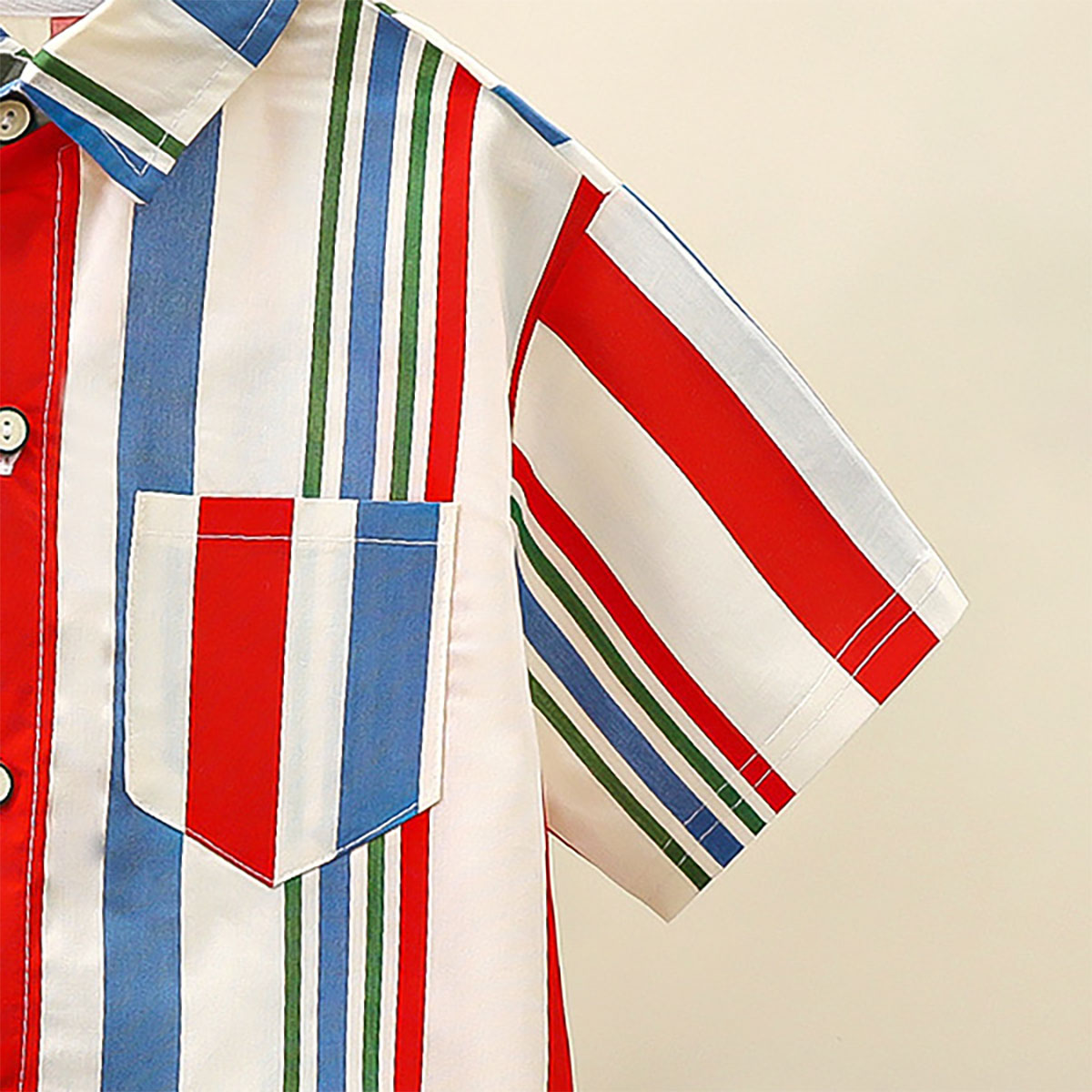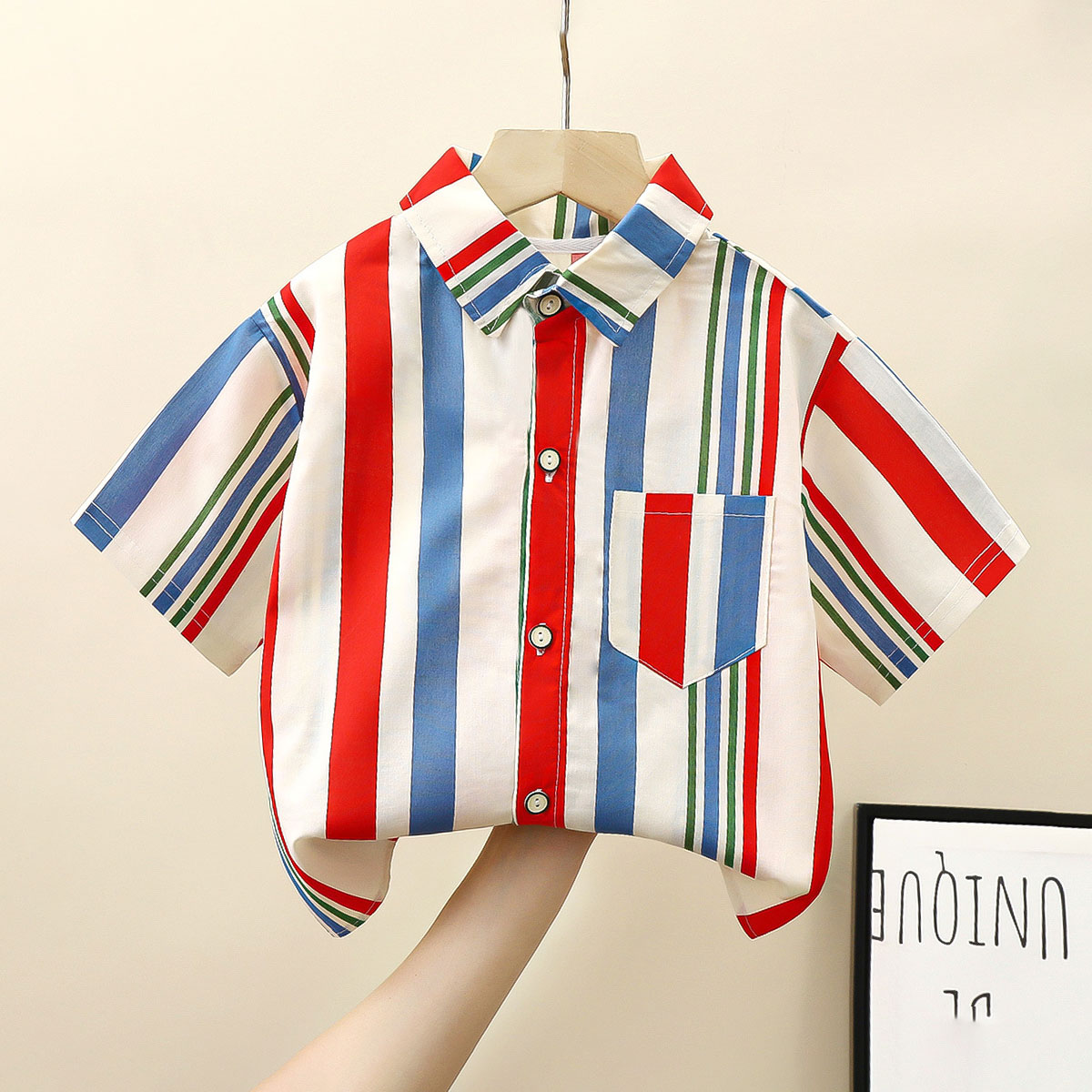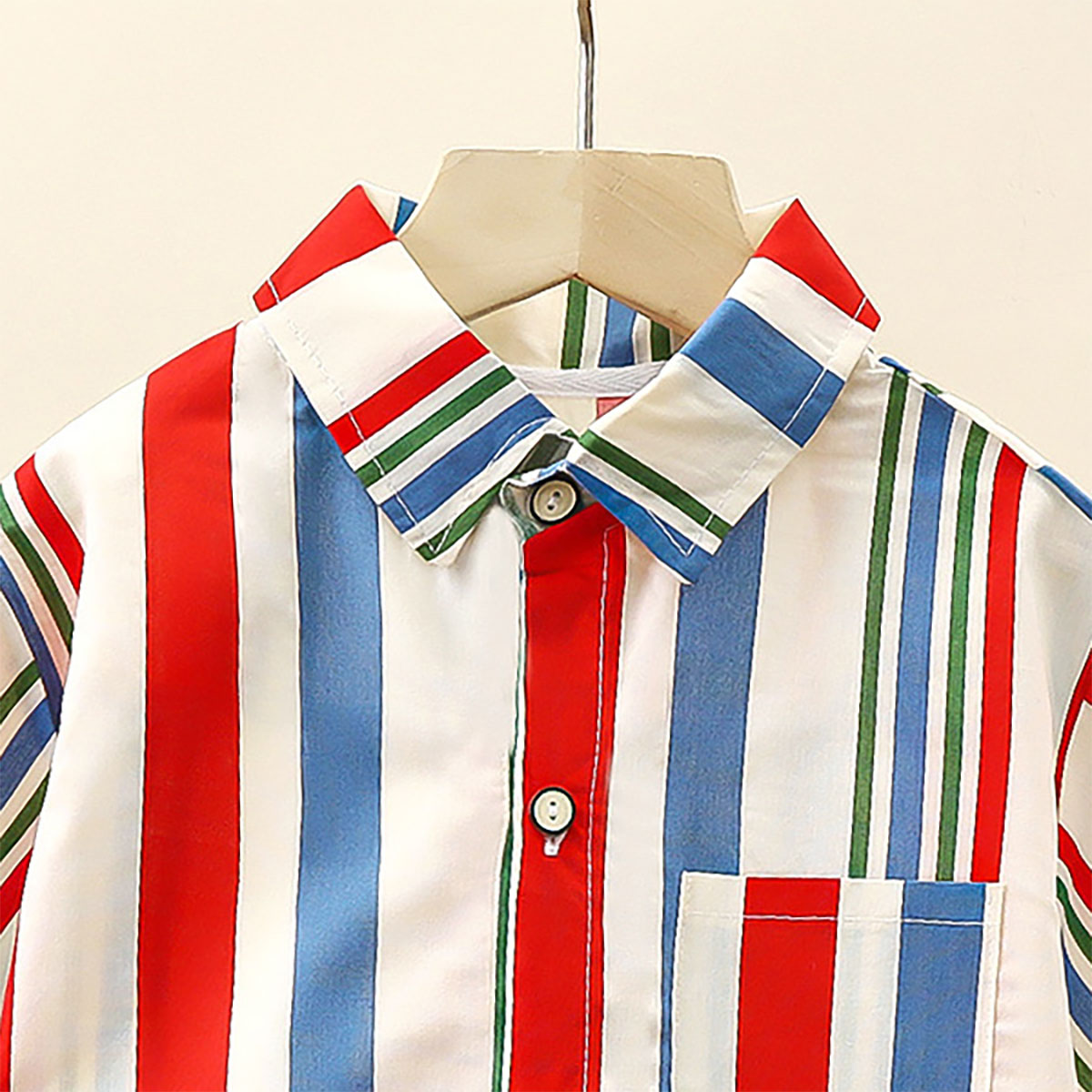 Colorful Stripe Kids’ Shirt! With lively sea blue, red, and tiny green stripes, it adds a burst of joy to their style. Comfy and cool, perfect for every adventure.